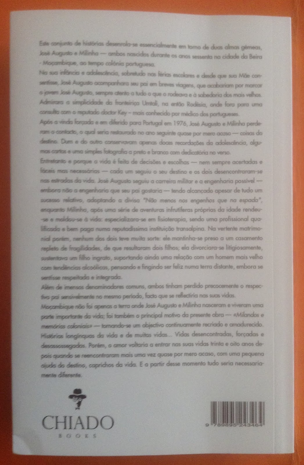 Moçambique não foi apenas a terra onde José Augusto e Milinha nasceram e viveram uma parte da vida; foi também o principal motivo da presente obra - 'MILANDOS E MEMÓRIAS COLONIAIS' - tornando-se um objectivo continuamente recriado e amadurecido. Histórias longínquas da vida e de muitas vidas ... Vidas desencontradas, forçadas e desassossegadas. Porém, o amor voltaria a entrar nas suas vidas trinta e oito anos depois quando se reencontraram mais uma vez quase por mero acaso, com uma pequena ajuda do destino, caprichos da vida. E a partir desse momento tudo seria necessariamente diferente."